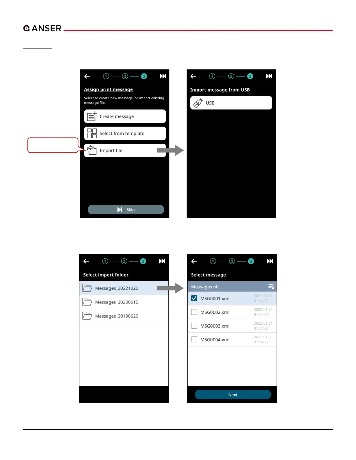 STEP 1: Connect a USB and press Import File to choose messages stored in it.