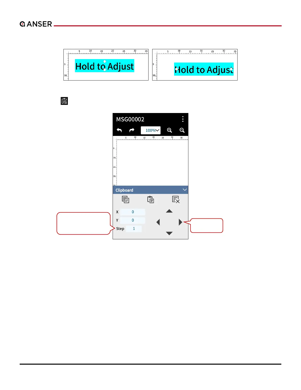 Anser A1 - Figure 1-27. Add Object - Hold to Adjust Position; Figure 1-28. Add Object - Adjust Position in Clipboard