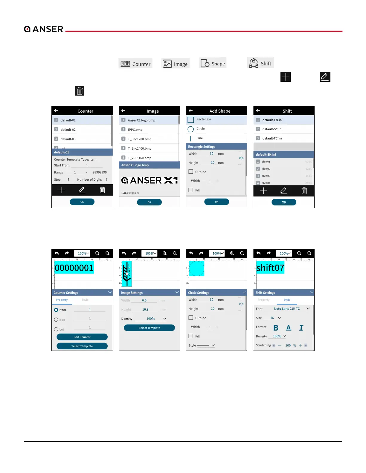 of Counter, Image, Shape and Shift will show respectively. Use lower buttons to create “ ”, to edit “ ”, or