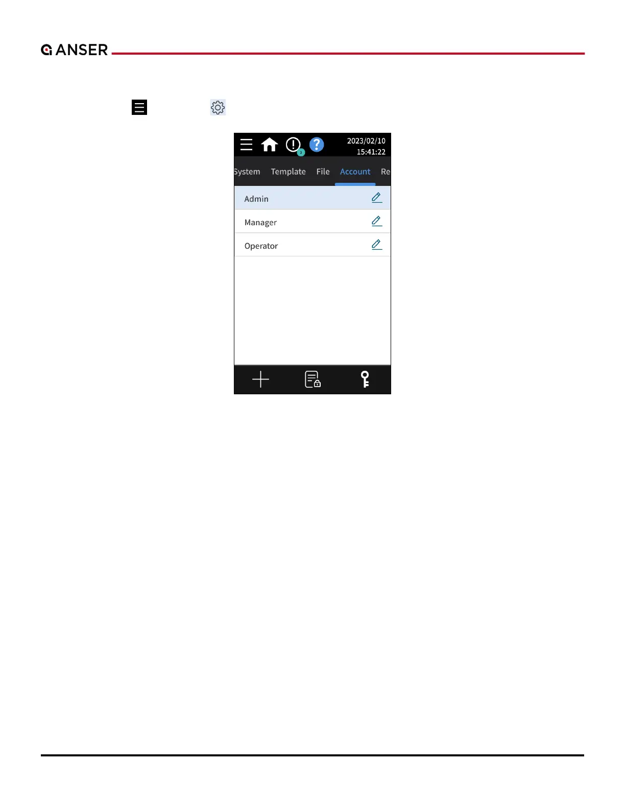 The A1 system provides three default accounts (Admin, Manager, and Operator), and each has their respective access