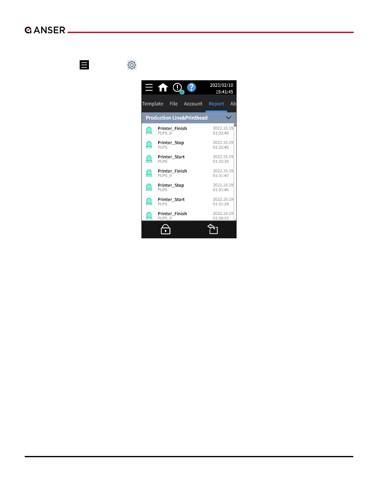 The Report page provides information and logs of Production Line & Printhead, System, Connection and Ink Operation.