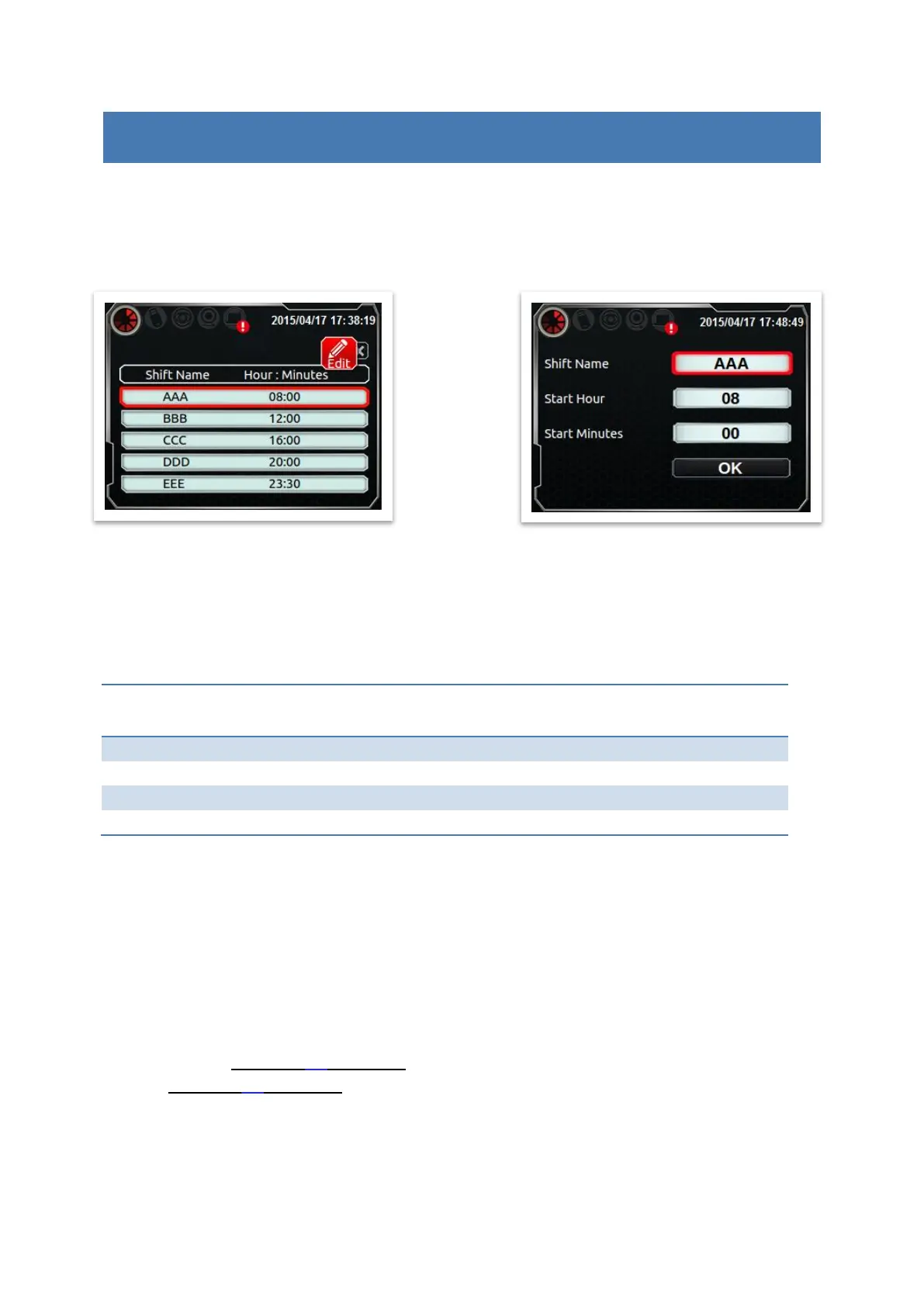 Ex: Now is 09:14, so the shift name is ‘AAA’.