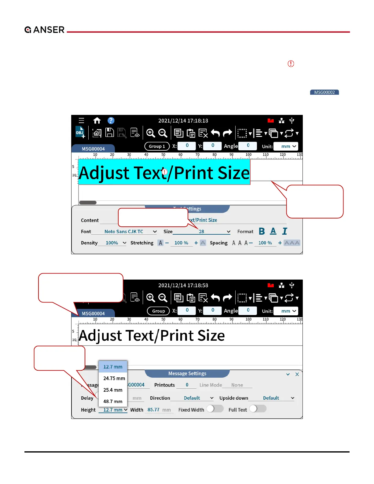the Size field in the Text Settings page or go to Message Settings page by pressing Message Name Tab