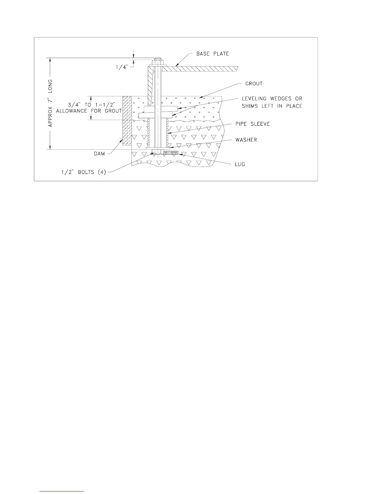 be grouted to the foundation. The legs of the base plate should be completely filled with grout and
