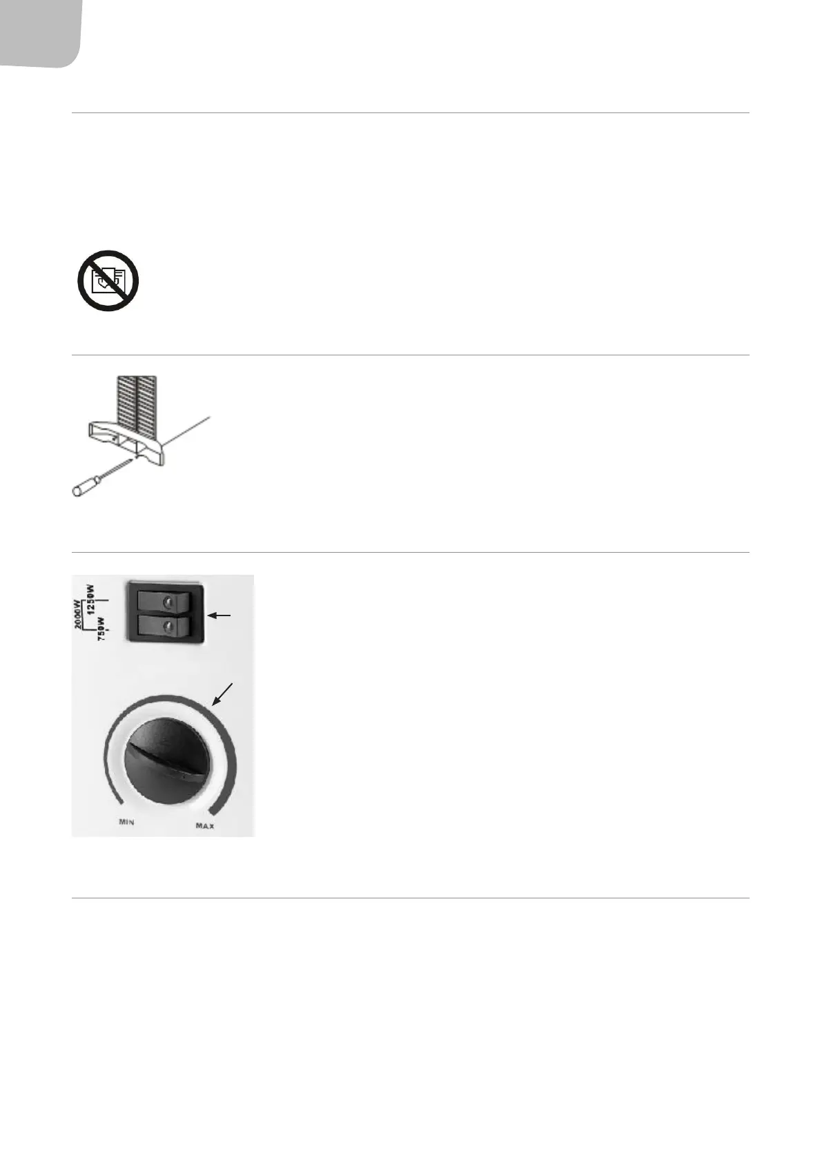 Produkten är av typen konvektorelement utan äkt och har tre eektlägen (750 W, 1250 W, 2000 W) som ställs in med två strömbrytare.