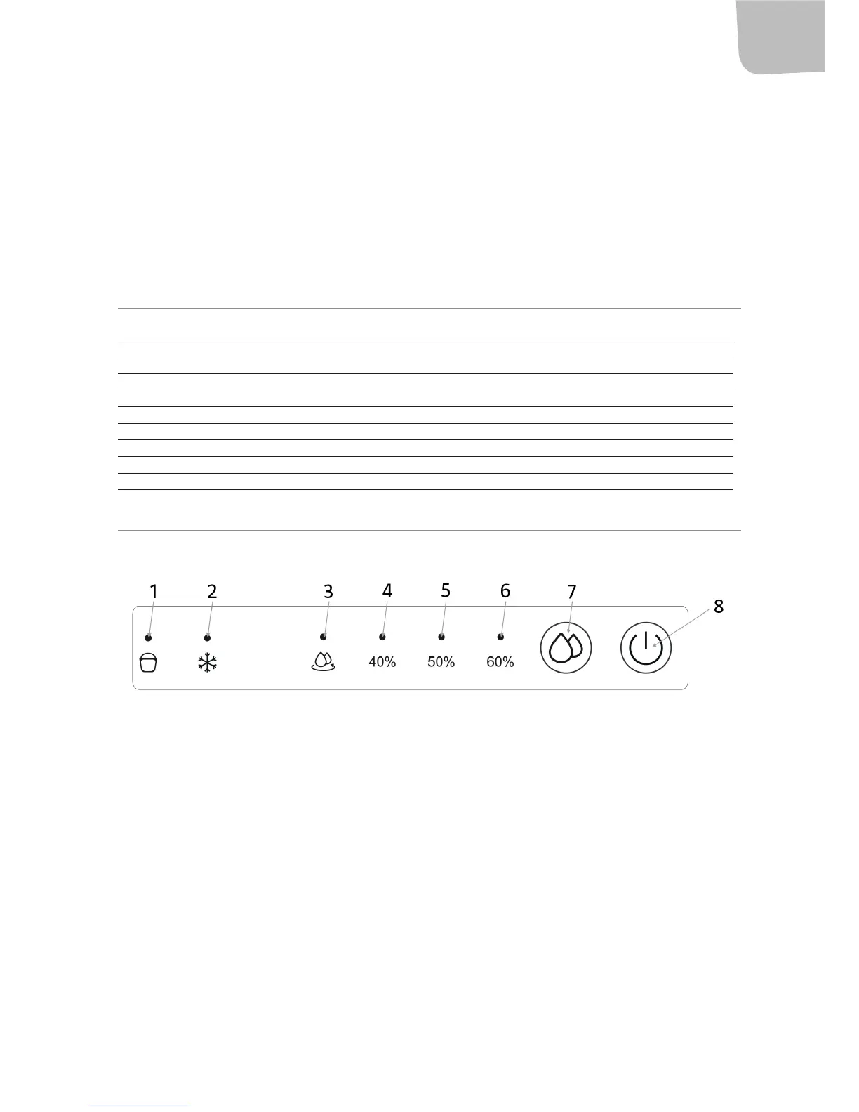 6. Indikeringslampa för driftläge 60 % luftfuktighet.