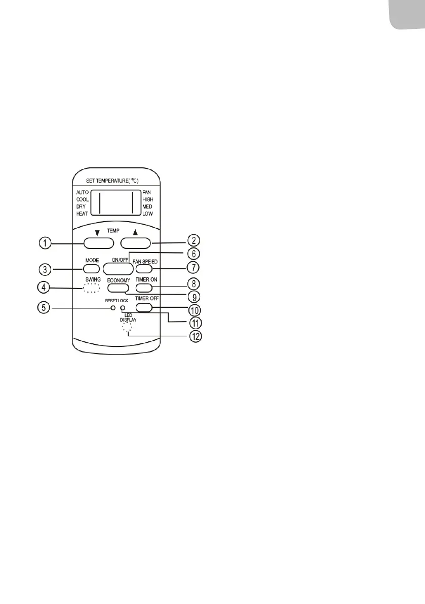 1. Driftlägen: AUTO, COOL, DRY, HEAT (inte på modeller med endast kylning) samt FAN