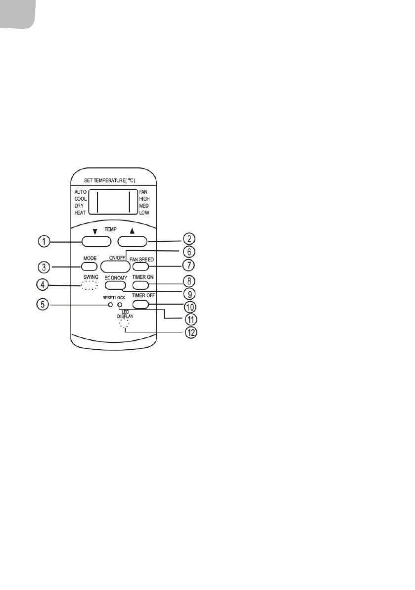 1. Driftsmodus: AUTO, COOL, DRY, HEAT (ikke på modeller med kun kjøling) samt FAN