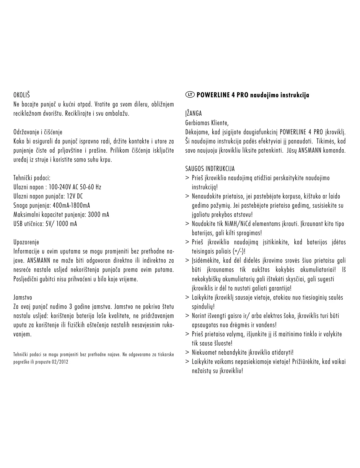 Tehnički podaci se mogu promjeniti bez prethodne najave. Ne odgovaramo za tiskarske