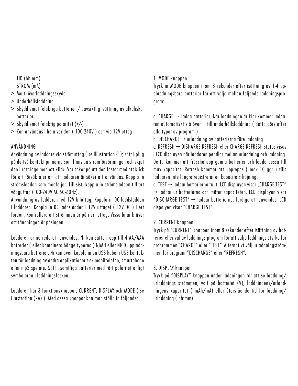 Laddaren har 3 funktionsknappar; CURRENT, DISPLAY och MODE ( se