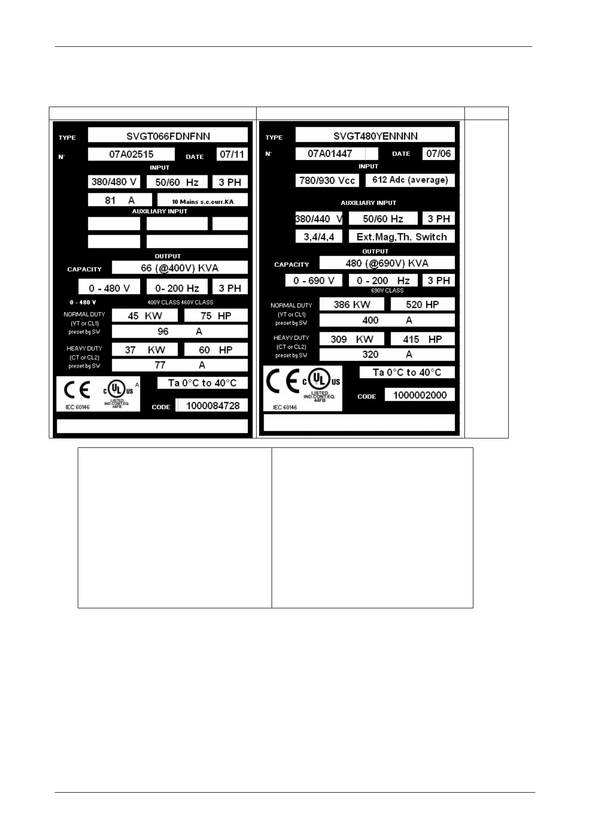 The following is an example of the nameplate. This can be found on every GT3000 drive. It shows the rated values.