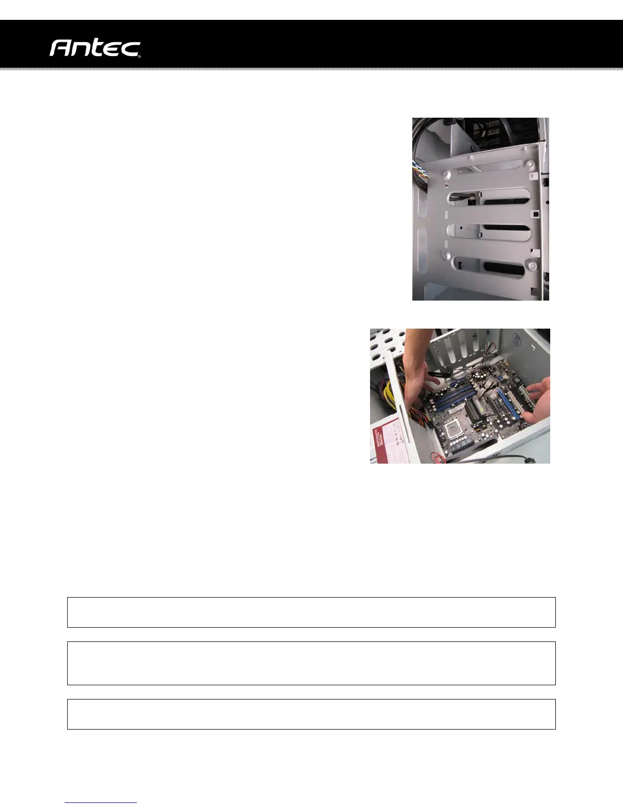 Note: The motherboard tray has standoffs pre-installed for the most common ATX mounting