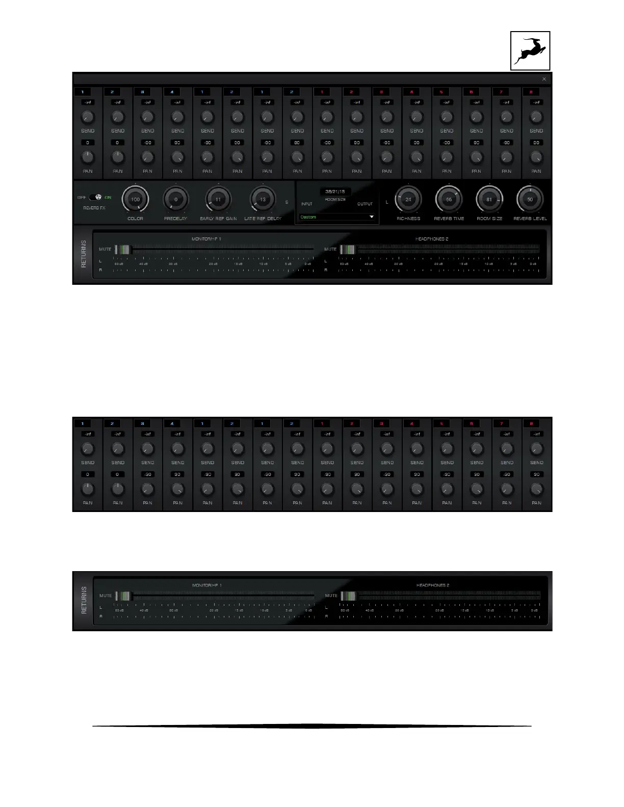 Drag the faders in the 'Returns' area to hear AuraVerb from the monitor and/or headphone