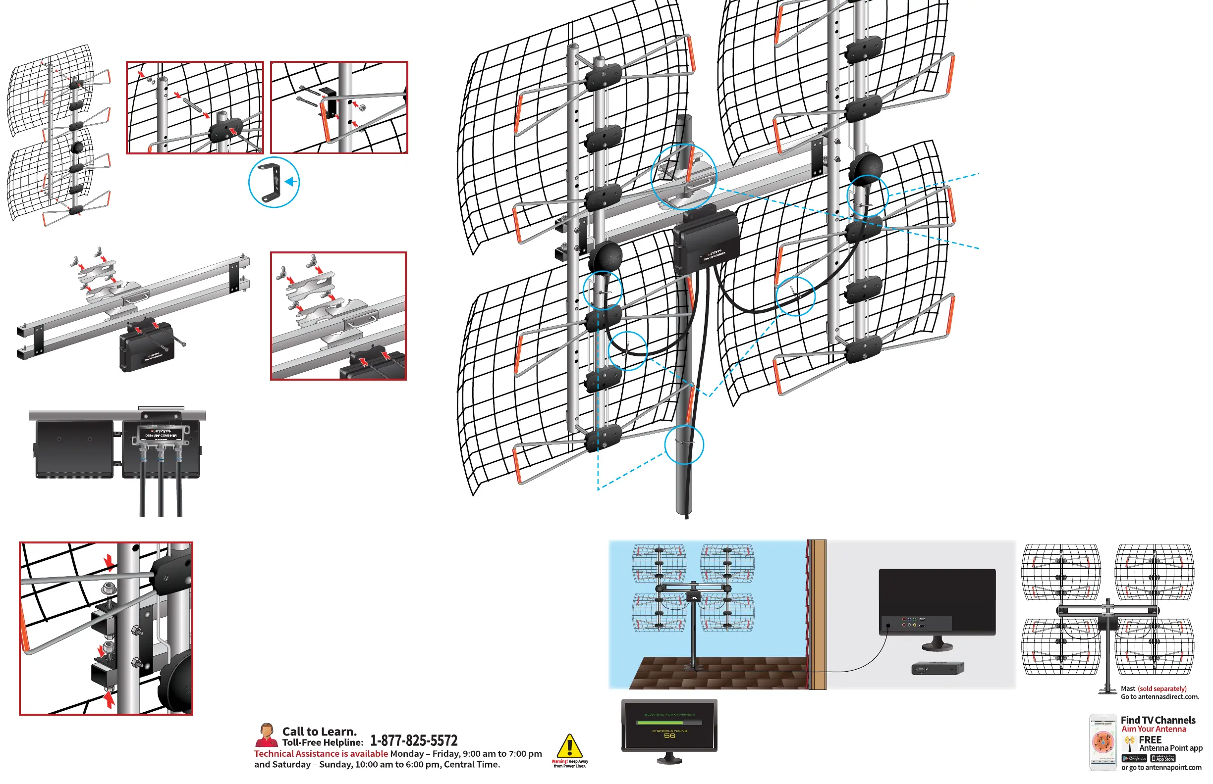 Required: Coaxial Cable (sold separately), Adjustable Wrench, Power Drill, 3/16” Drill Bit, 8 and 10mm Ratcheting Drivers, and a #2 Phillips Screwdriver.