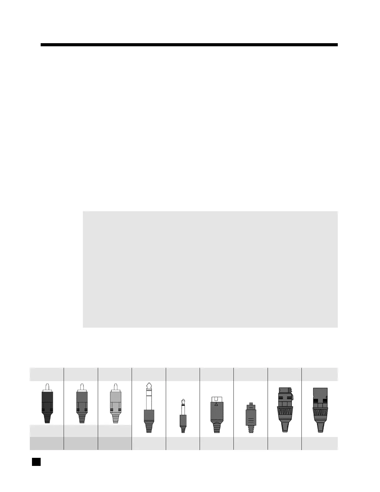 The following pages of illustrations contain a variety of standard cable/connectors that are used to connect