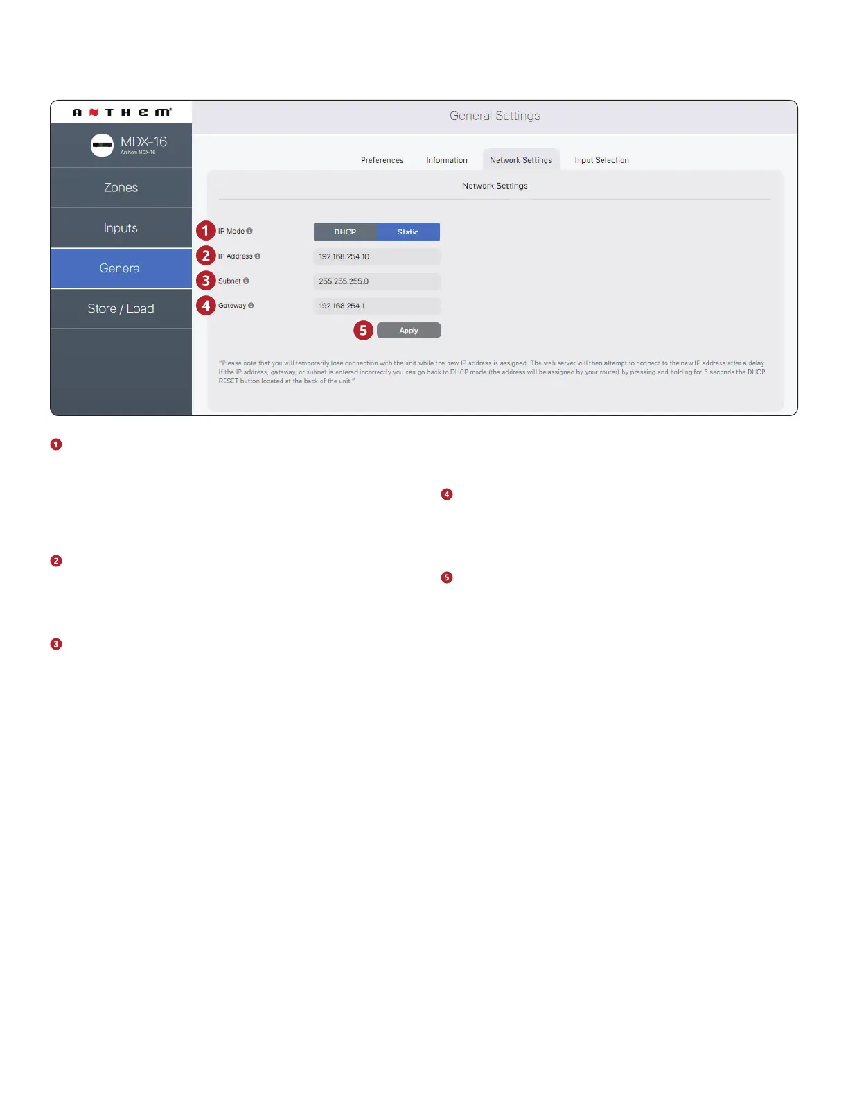 IP Mode: Toggles the MDX between DHCP and Static net-