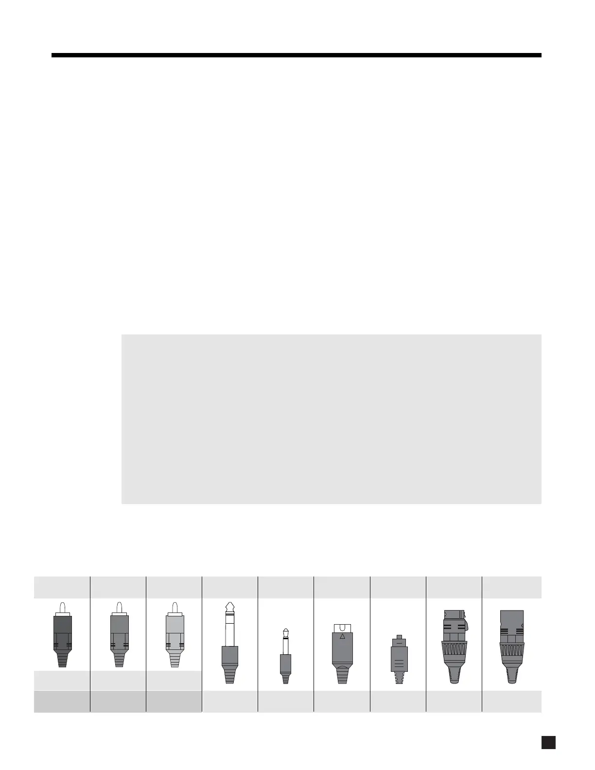 The following pages of illustrations contain a variety of standard cable/connectors that are used to connect