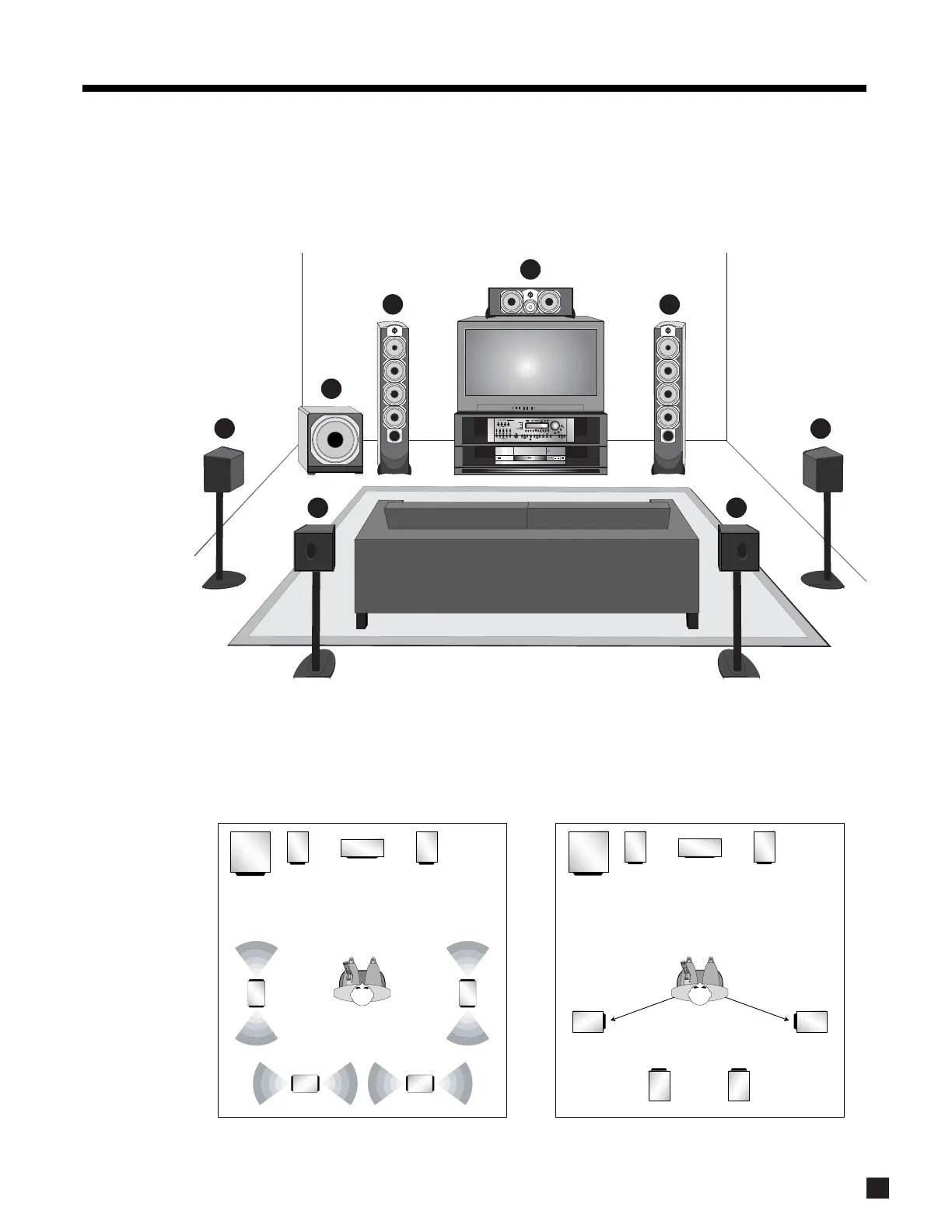 These illustrations show the typical speaker placement for a 7.1-channel surround system, the ‘.1’ channel
