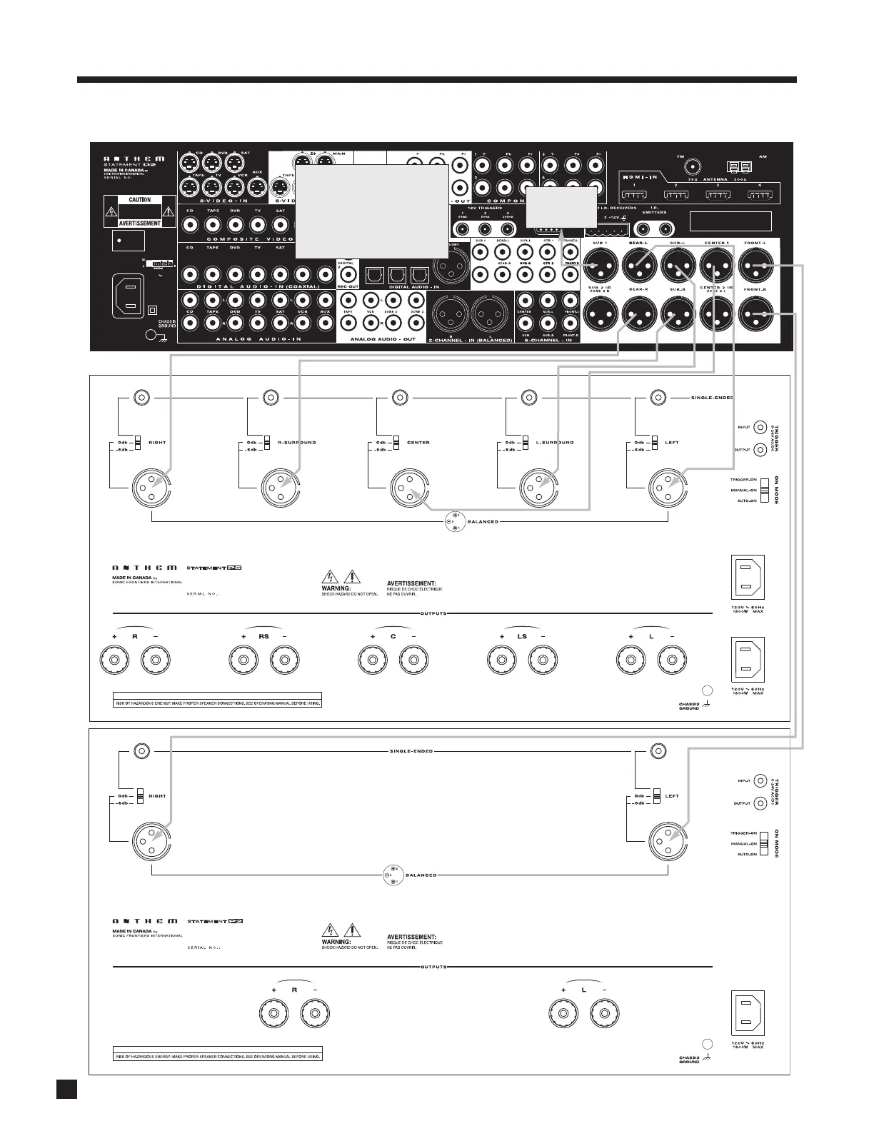 Example 3: Processor to amplifiers and subwoofer (Balanced connection shown, single-ended is similar)