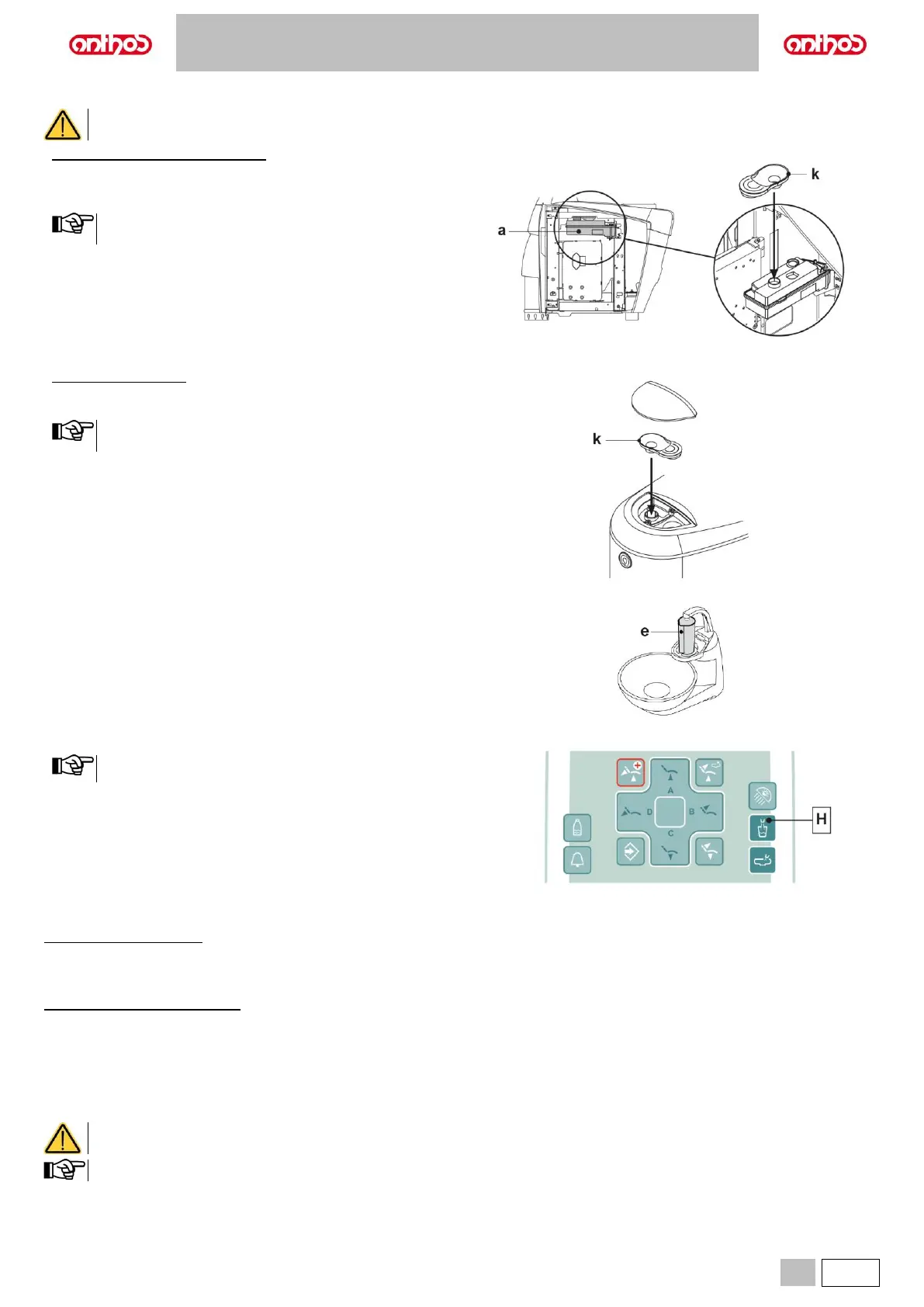 • Remove plug (k) and pour disinfectant fluid inside tank until it is full.