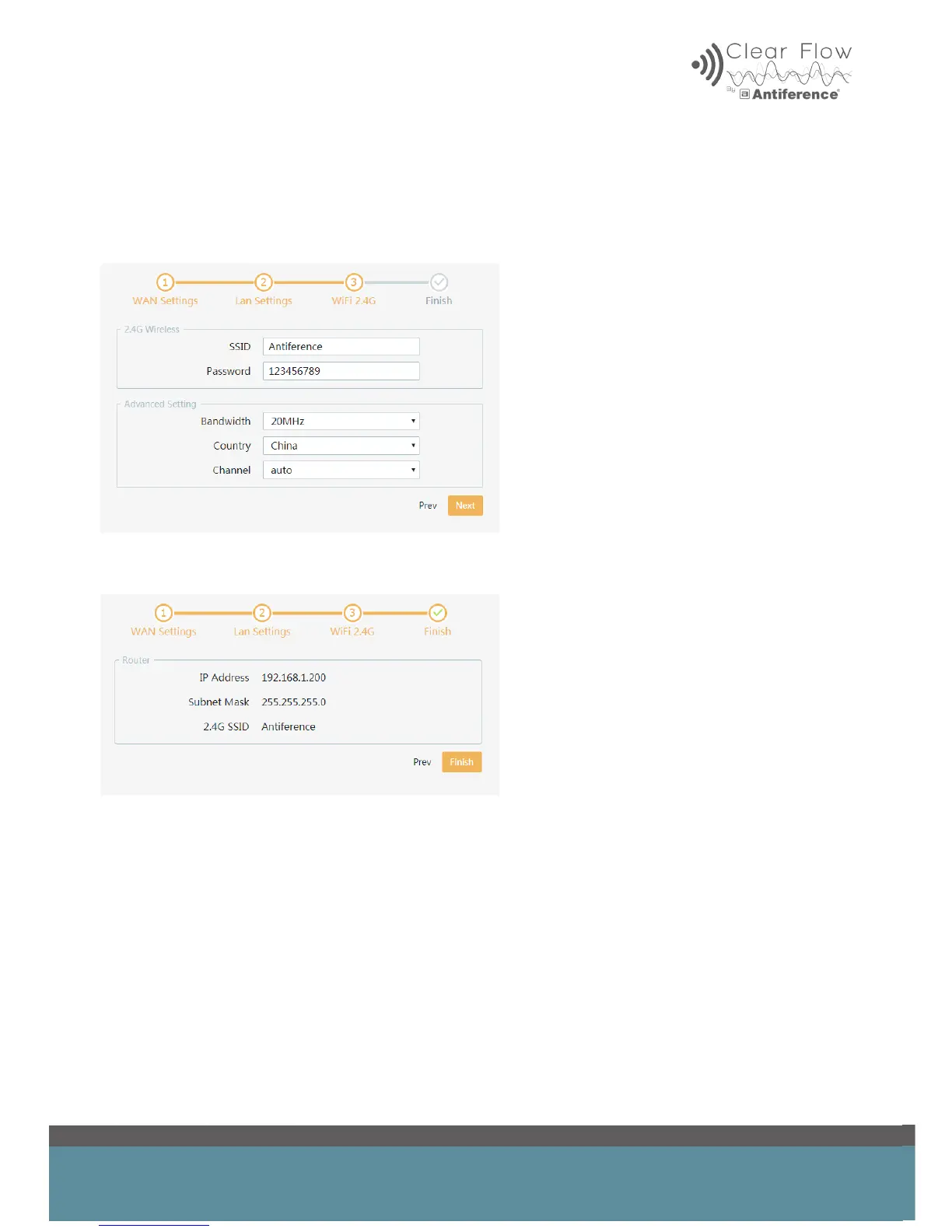 ANTIFERENCE Clear Flow - WiFi Settings for Router; Router Setup Summary