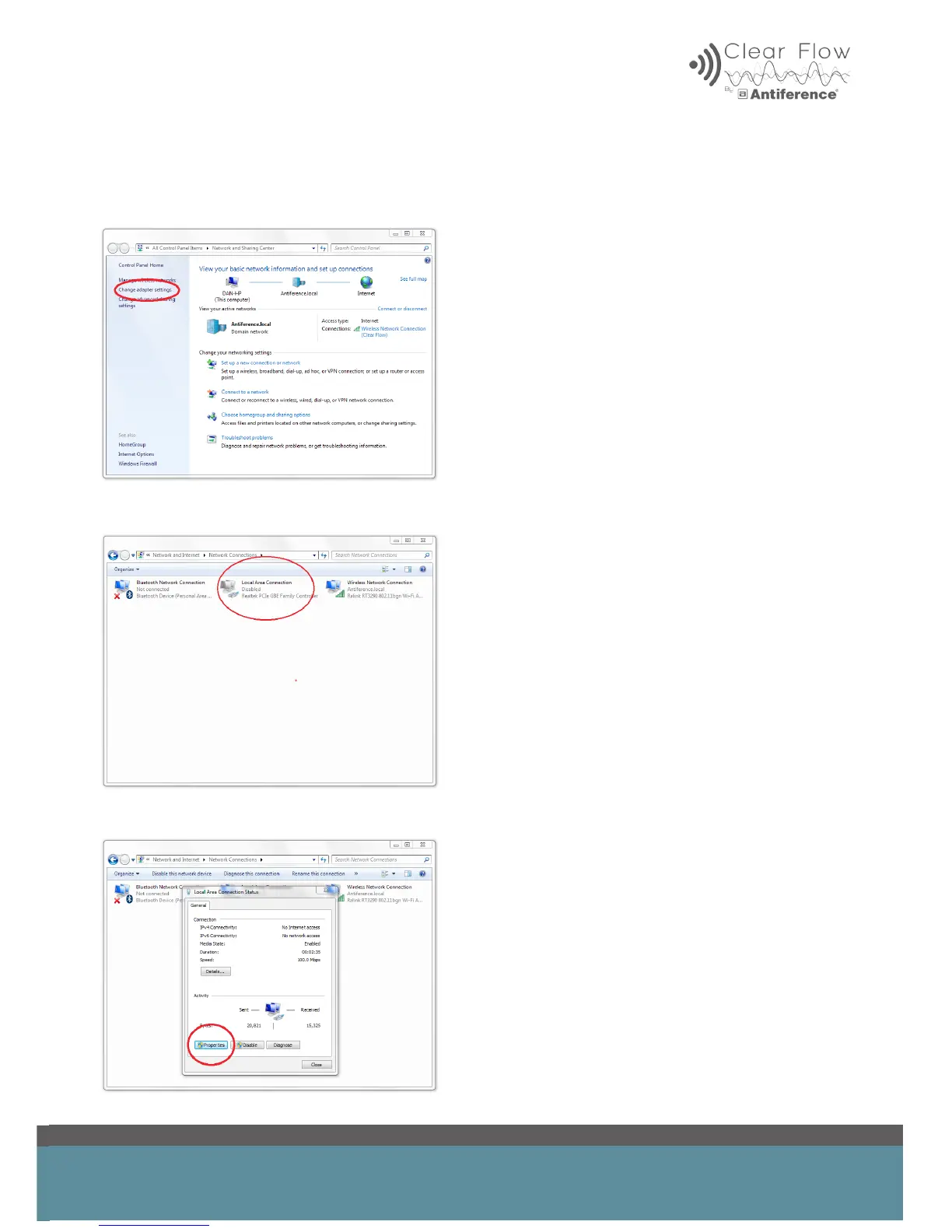 ANTIFERENCE Clear Flow - IP Configuration for Wired Connection; Windows IP Address Settings