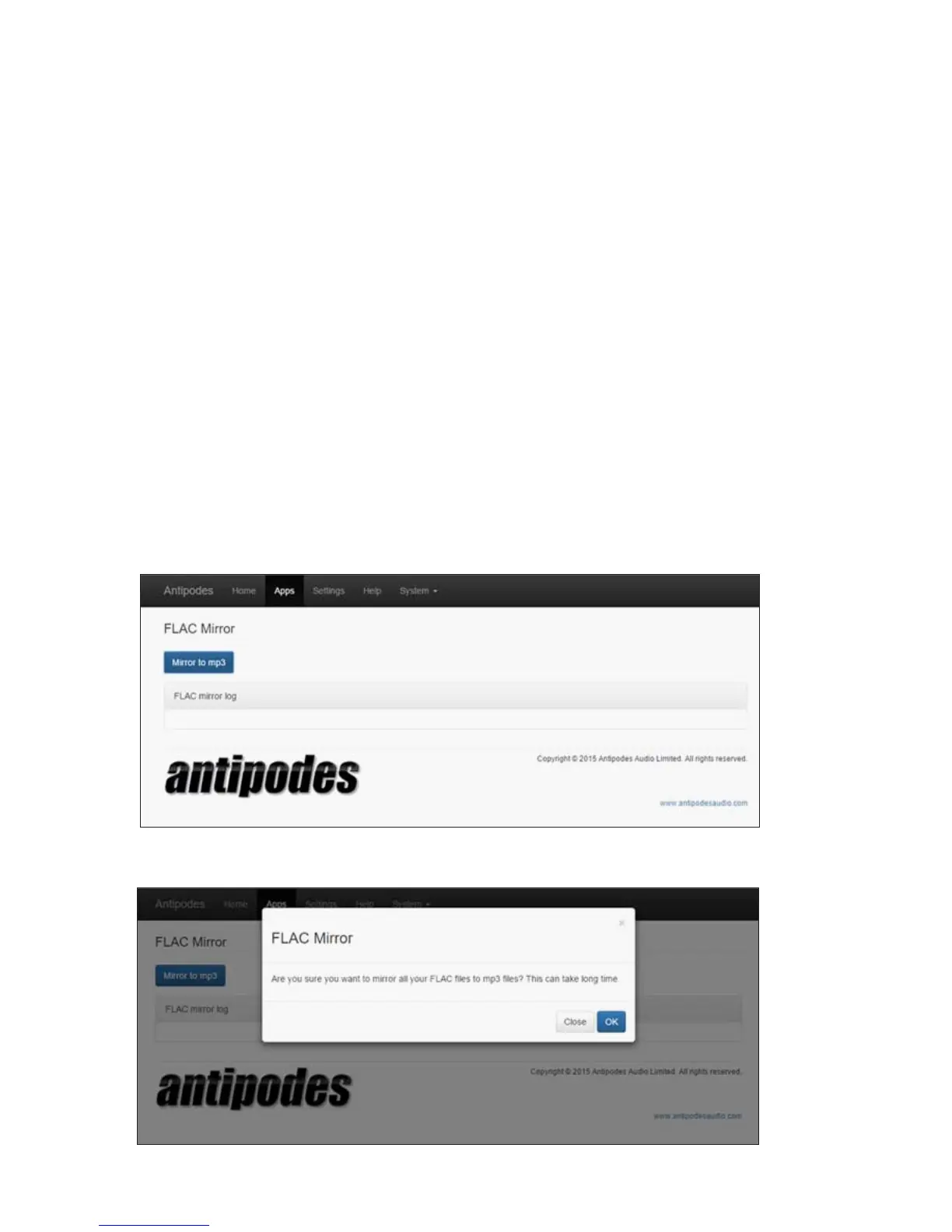 At the Antipodes GUI, select the ‘Apps’ menu item, and then click on the ‘FLAC Mirror’ icon.