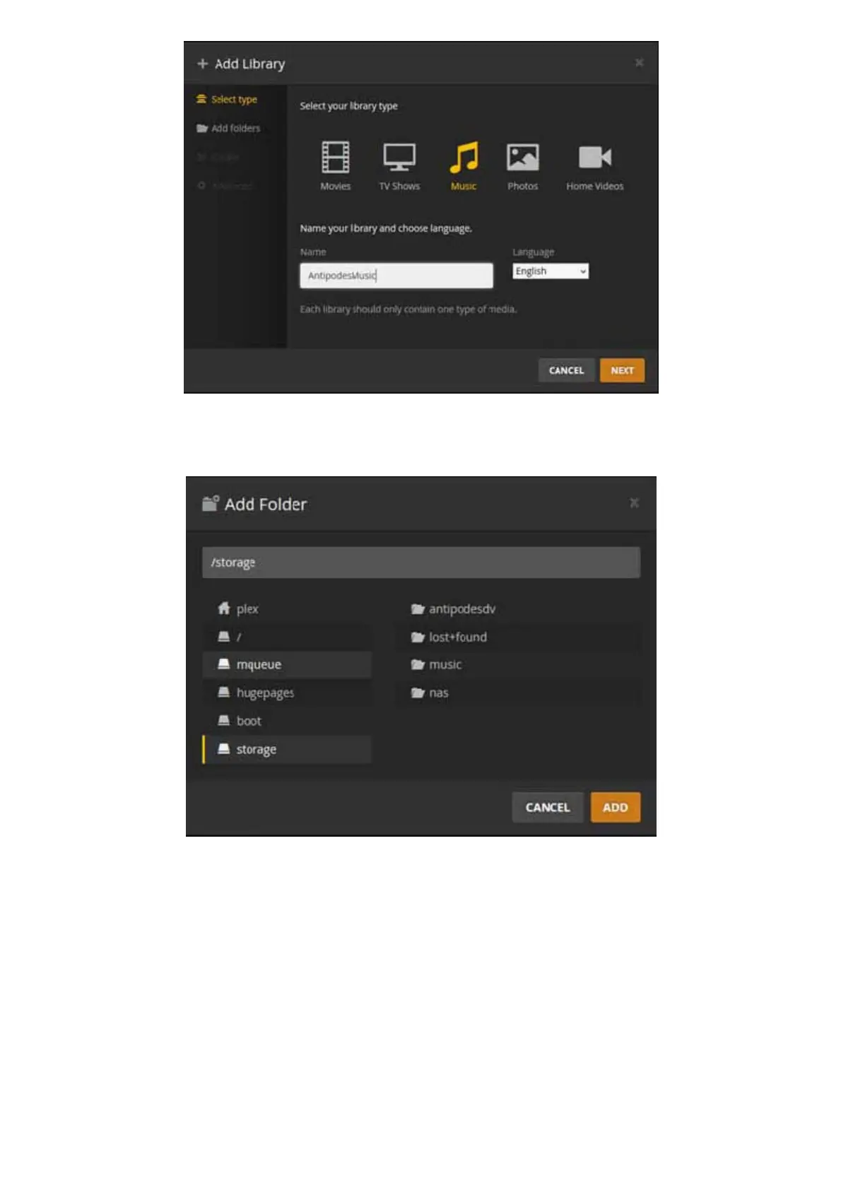 In the following screens you will select the folders to include in your music library. Click the ‘storage’ entry on the left hand side, then ‘music’,