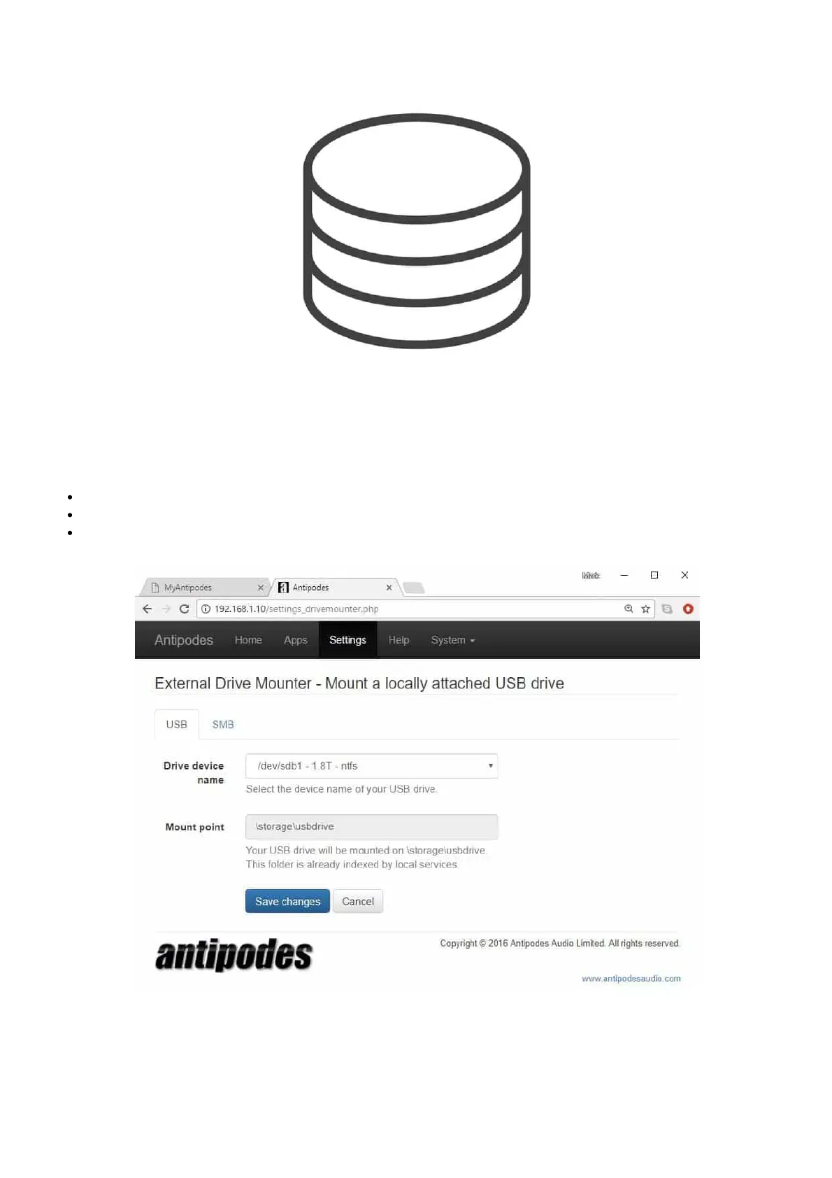 Connect the drive to a spare USB port on the back of the Antipodes