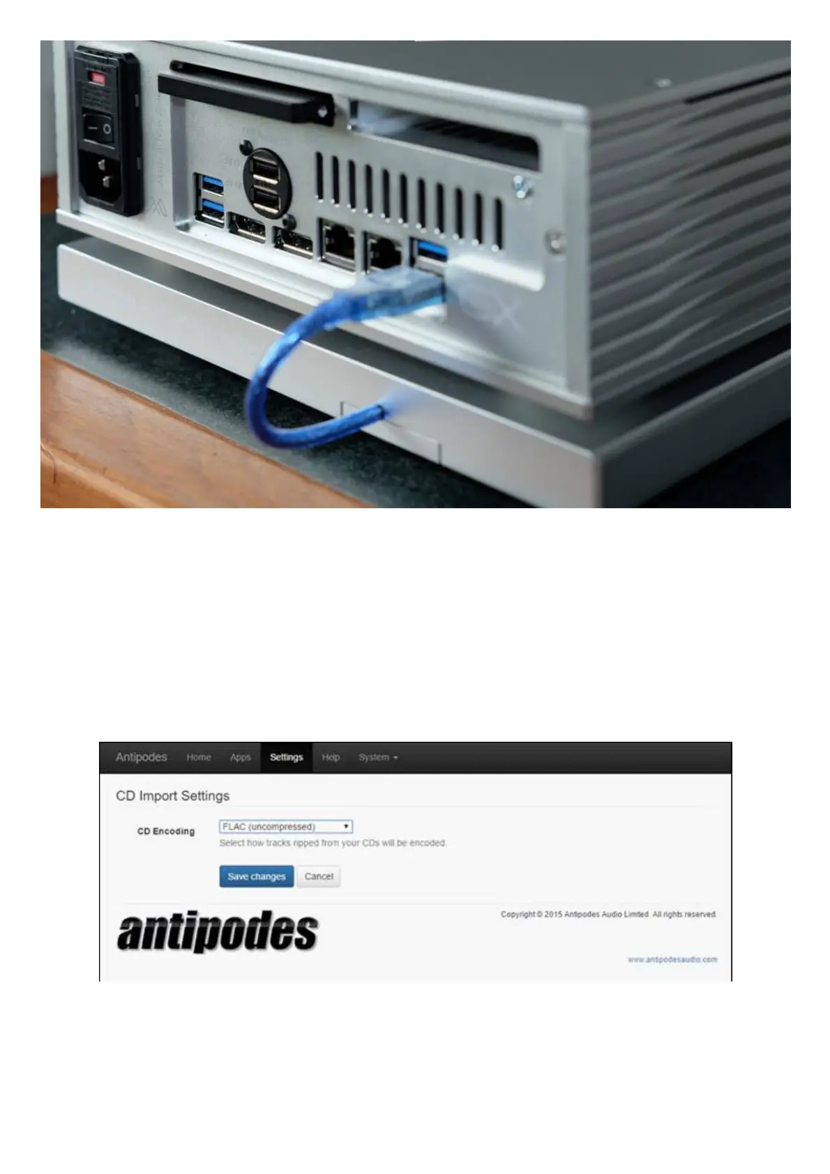 To rip a CD just insert the CD (label up) into the Antipodes, and wait until the CD ejects. The software has a time-out period where the disc may