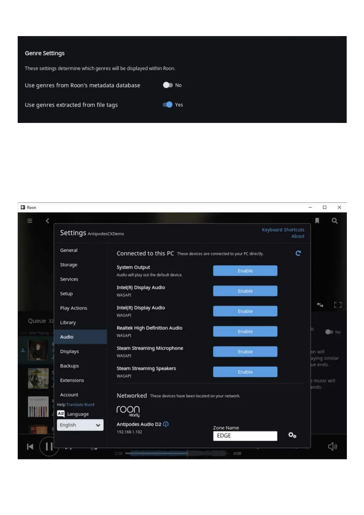 Once you have saved, the Antipodes will appear under ‘Networked’ as a Roon Ready device in Roon’s Audio Settings, and will display the IP