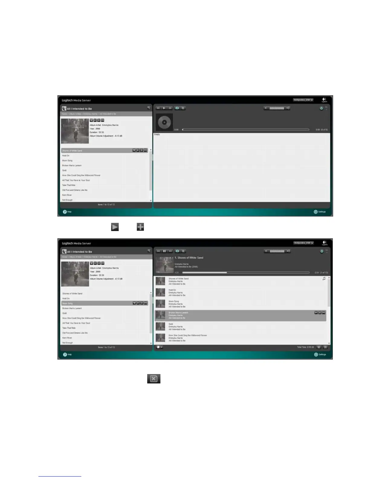 To clear the ‘playlist’ pane click the icon at the bottom right of the screen.