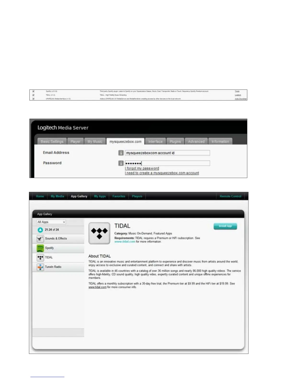 Log in to your mysqueezebox.com account, click the ‘App Gallery’ tab, select TIDAL and click ‘Install App’.