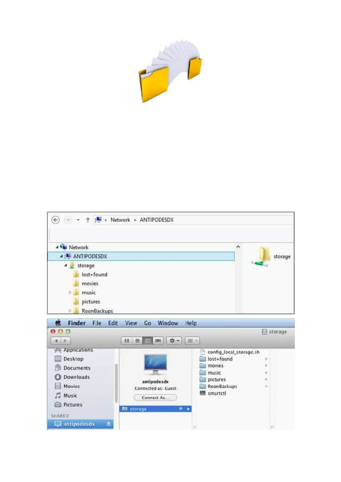 File Explorer – eg. \antipodes\storage, or \192.168.1.214\storage (use the IP address found by browsing to myantipodes.com). If you are