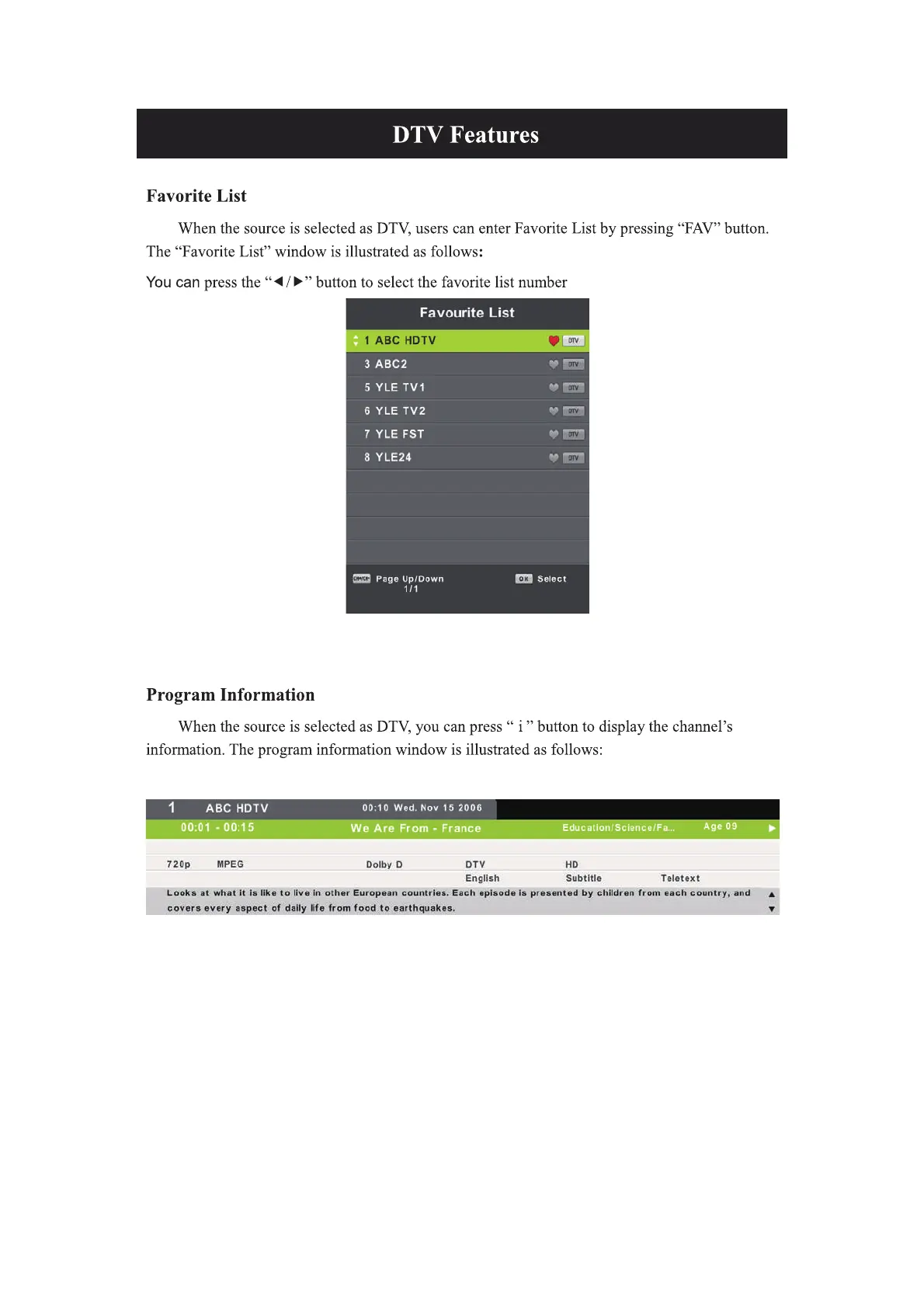 ANTTEQ AB32 - DTV Features; Favorite List; Program Information