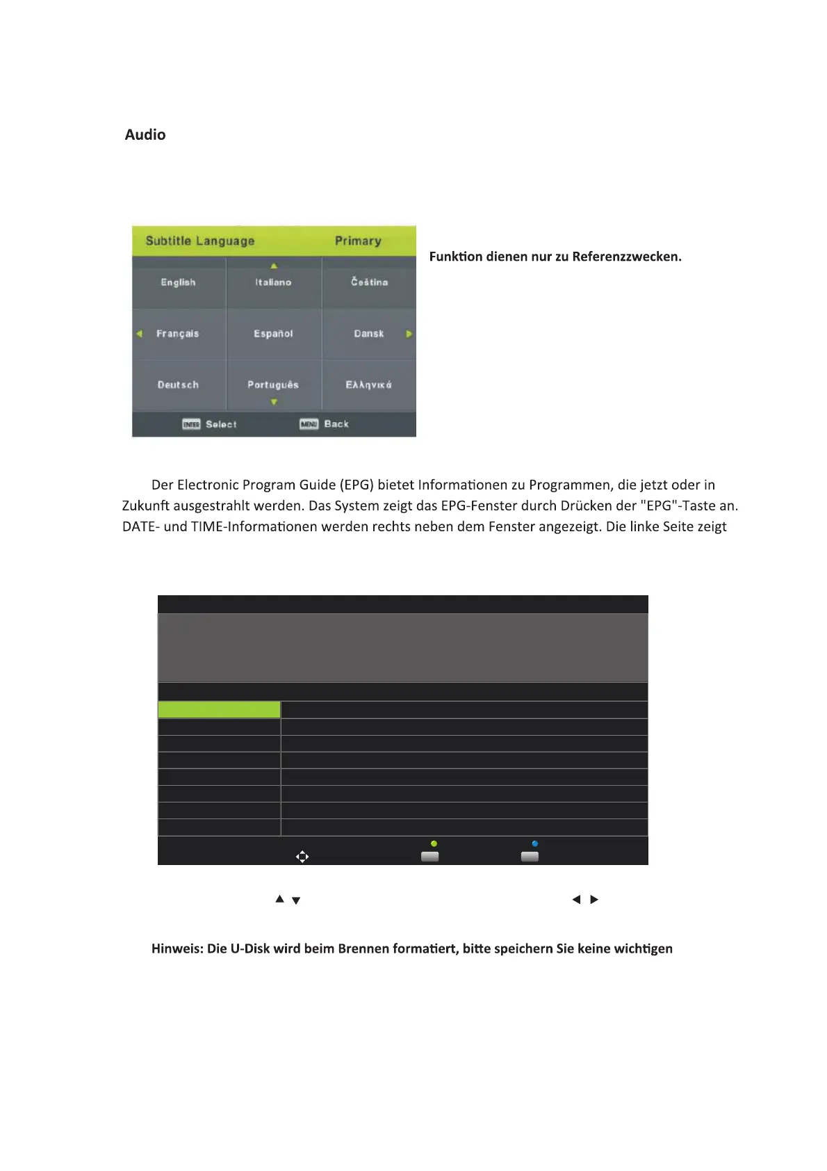 alle Kanäle. Die rechte Seite zeigt die Programme im Kanal an. Das ausgewählte Programm wird