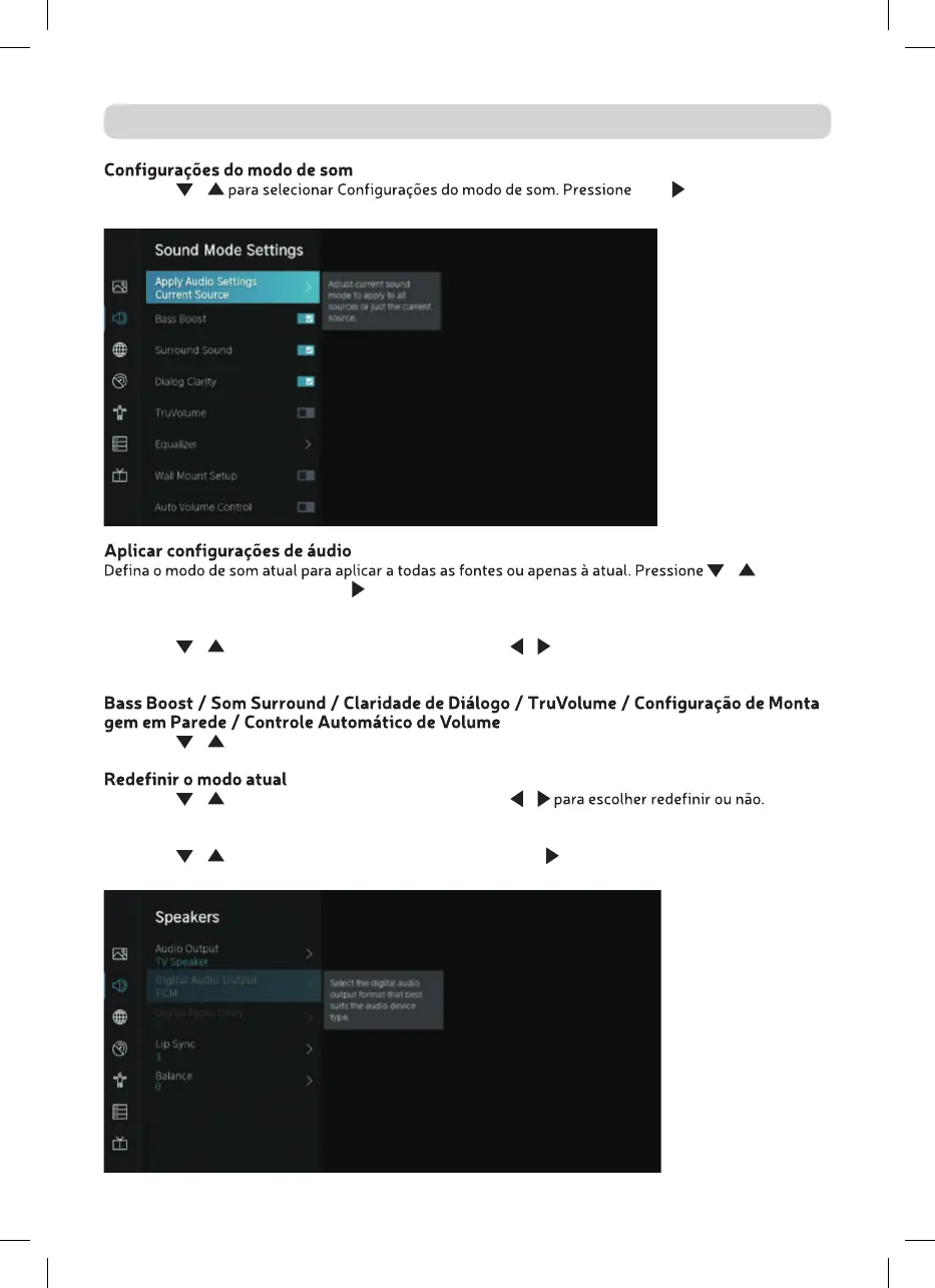 Pressione / para selecionar Alto-falantes. Pressione OK / para entrar no submenu.