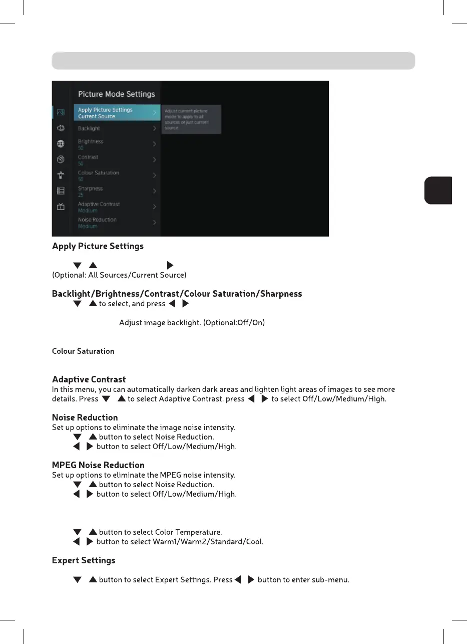 In this menu, you can adjust current picture mode to apply to all sources or just current source.