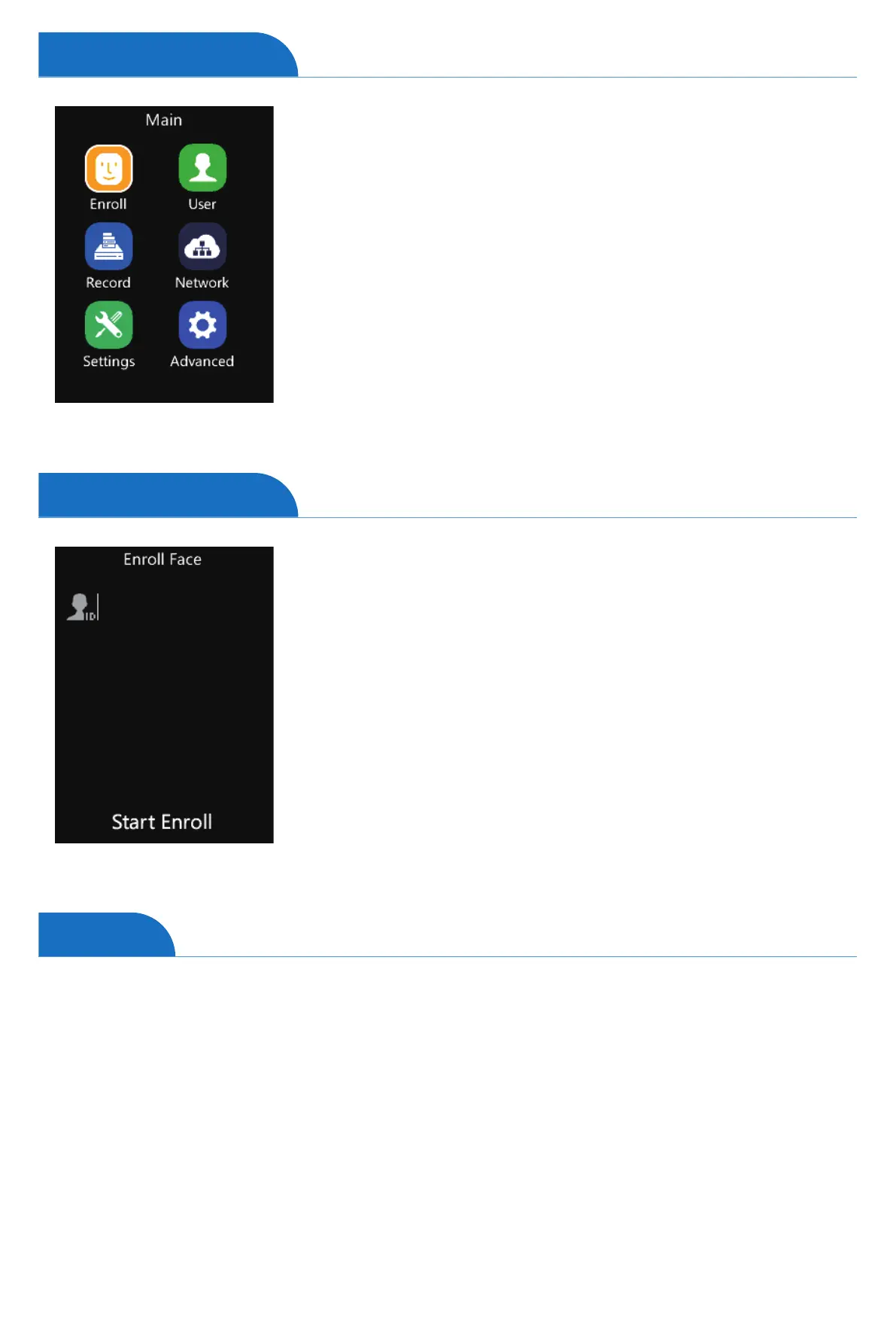 Tap “EnrollFace” to create a new user ID in the device.