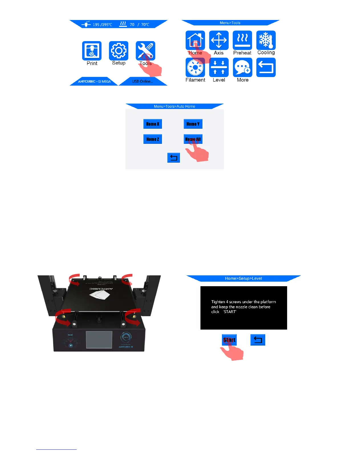 Click “Tools”-->“Level”, the machine will auto home first and then the X/Y/Z axis will