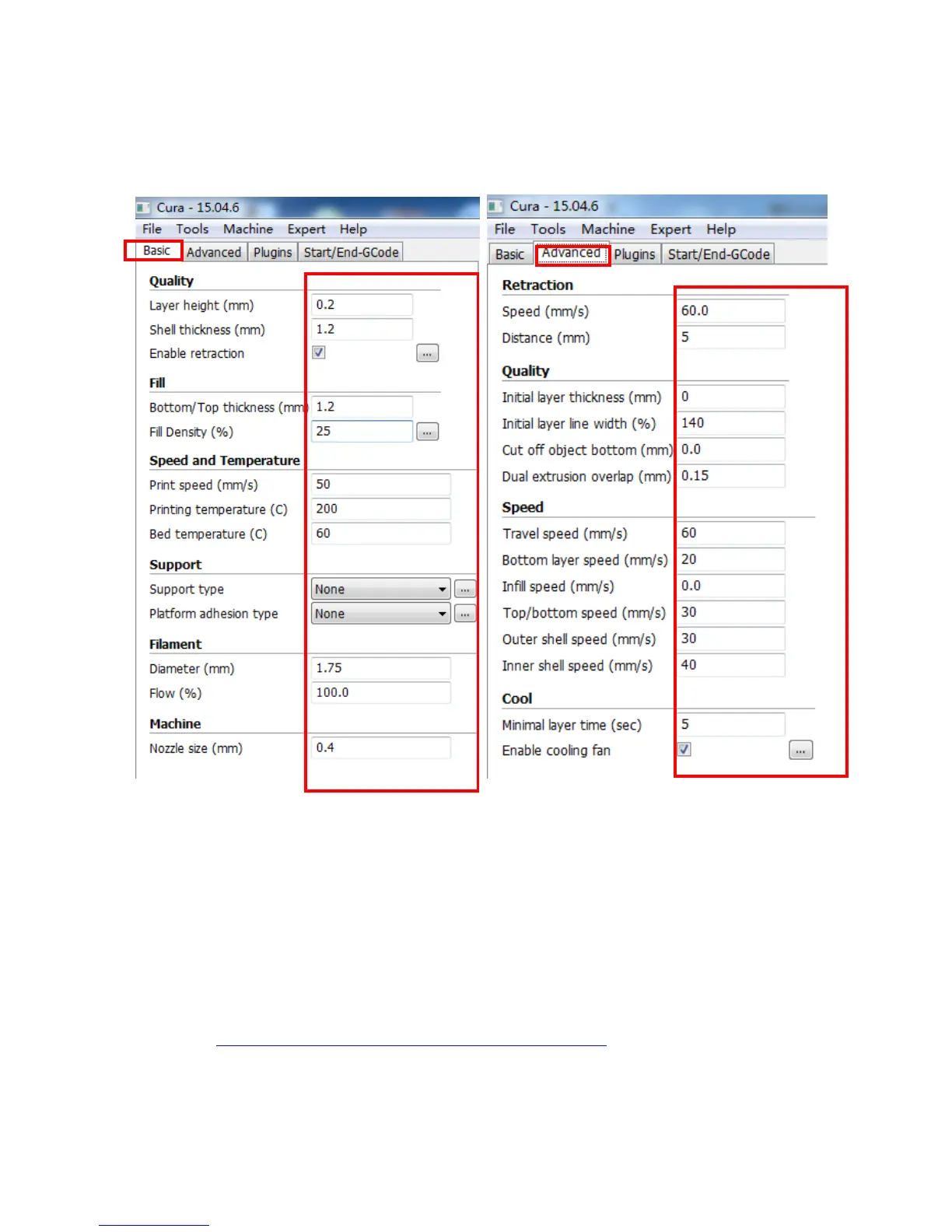 Suggested parameters of “Basic” and “Advanced” for printing PLA are shown in Fig.