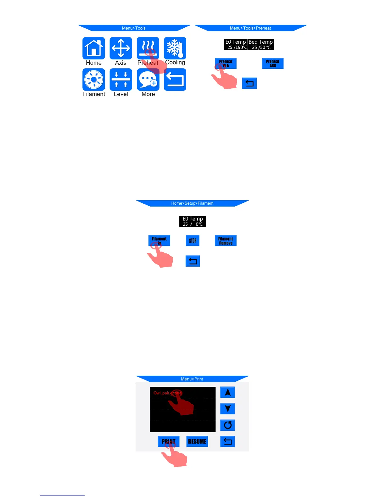 2. After pre-heat is finished, please click on Home screen “Tools”-->“Filament”-->