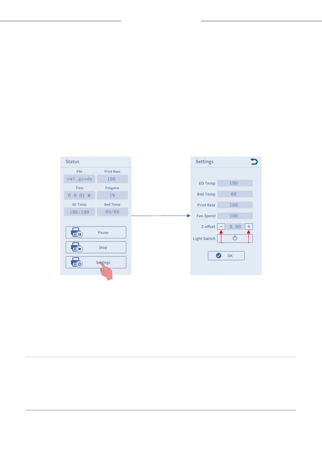 Click Settings on printing status interface, then click “+” or “—” of the Z-