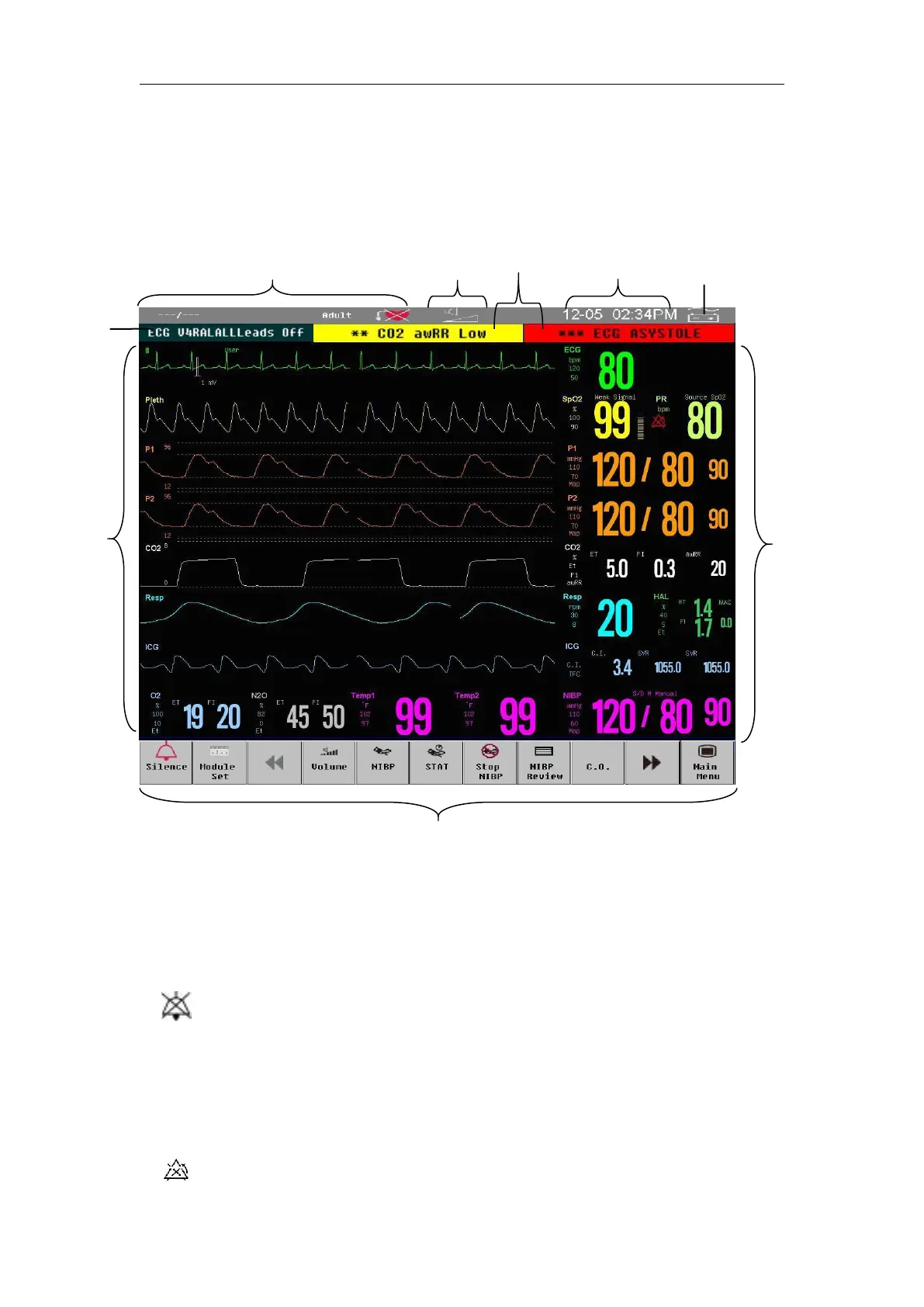 Measurement numerics, waveforms, patient information, alarm area and menu