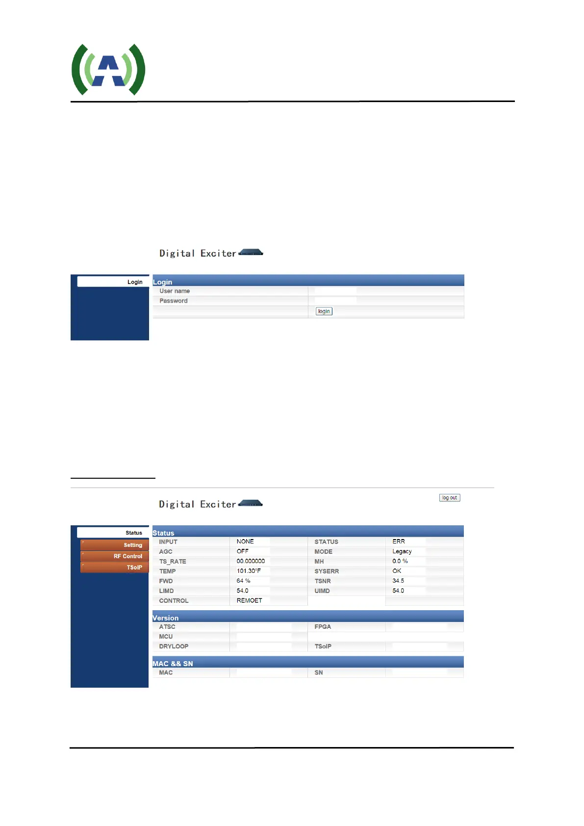 sensitive). The second “admin” tier provides full status and control of the exciter/translator and is accessed