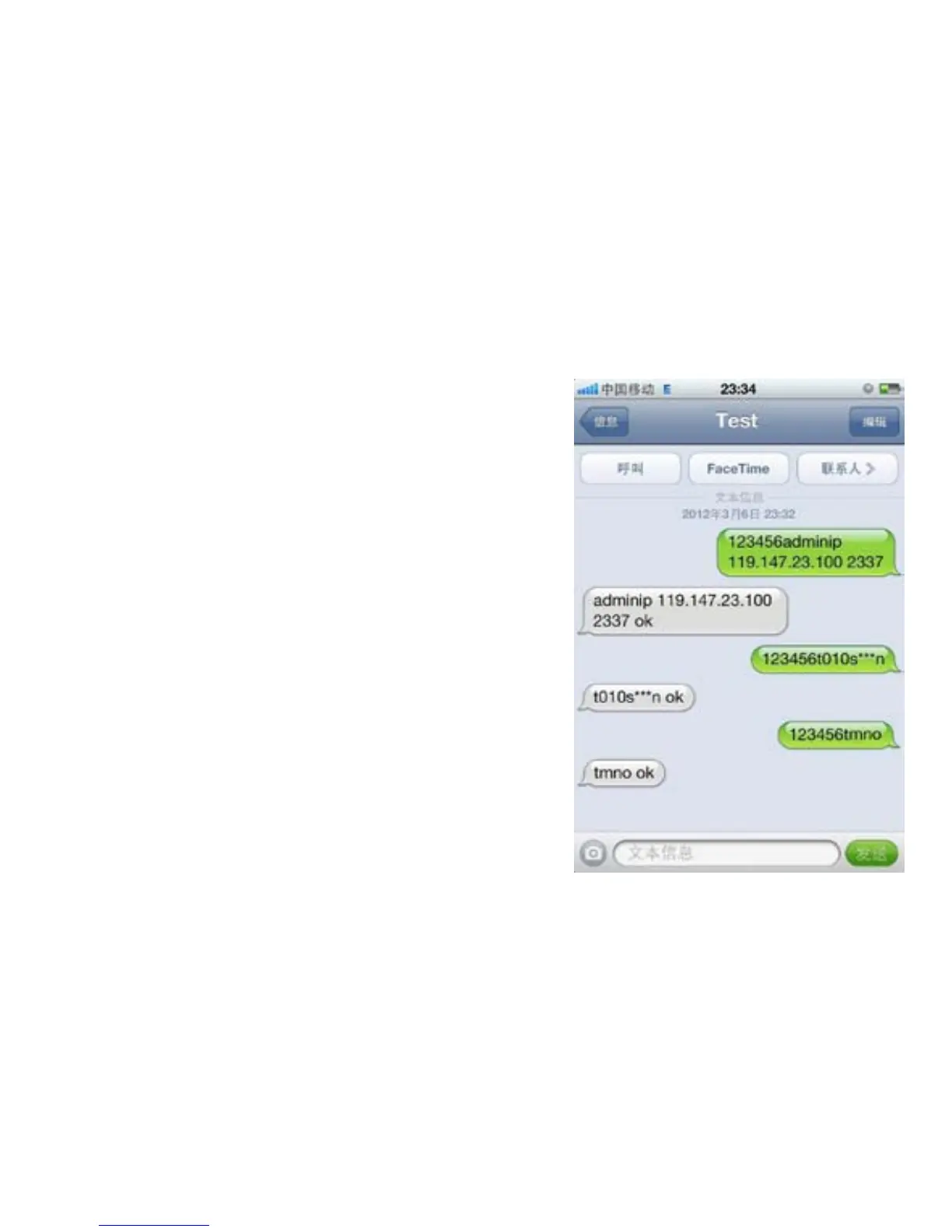 Send SMS“123456t010s***n” to the unit,