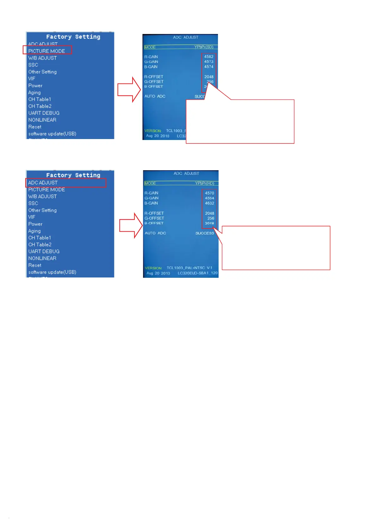 7Complete the ADC ADJUST debugging, press MENU key succession to exit the factory built-in menu to save the