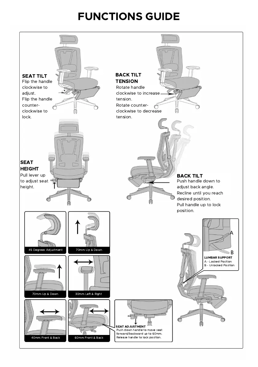 Aofeis ALPHA - Chair Functions Guide; Seat Tilt Adjustment; Back Tilt Tension Adjustment; Seat Height Adjustment