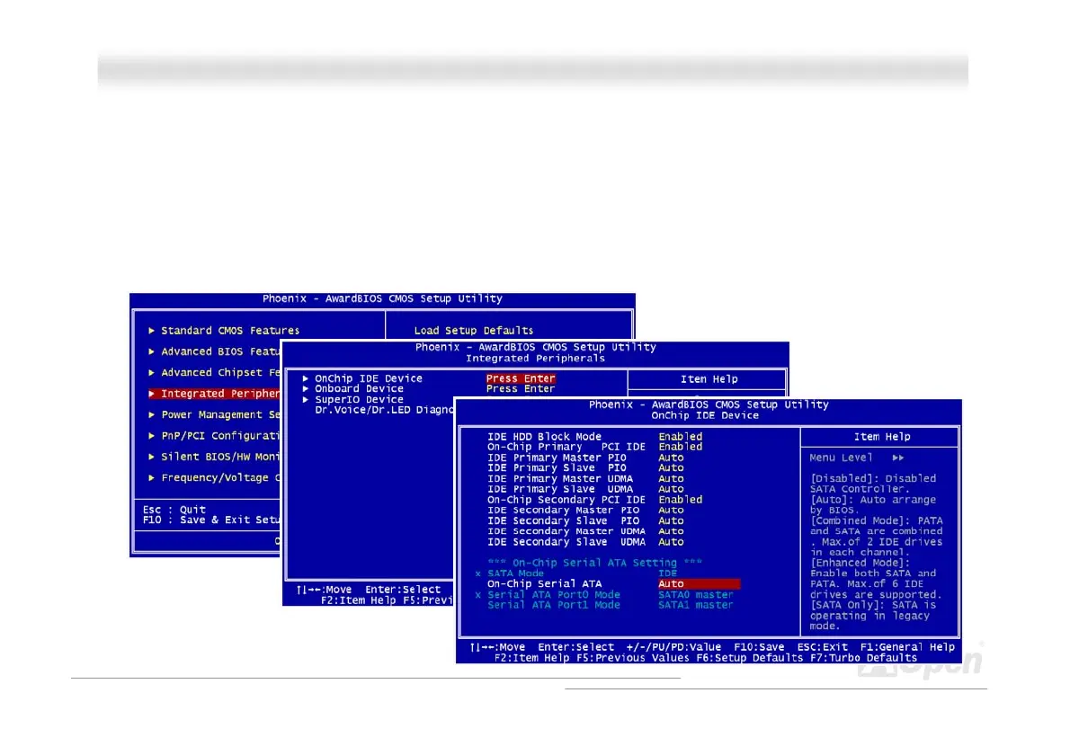 press “Integrated Peripherals Æ On-Chip IDE Device Æ On-Chip Serial ATA” to choose your preferable mode. If you have no