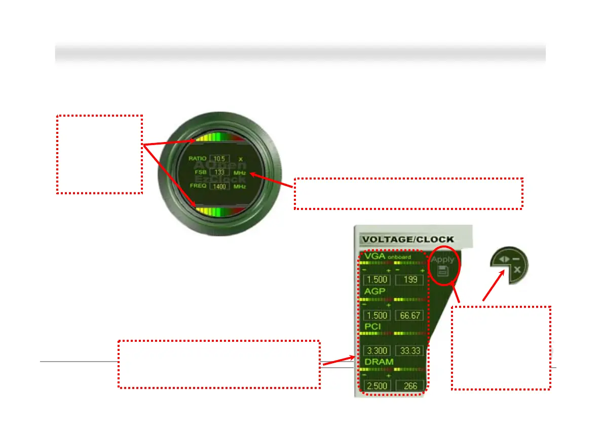 In EzClock utility, you can adjust CPU Front Side Bus (FSB), the voltage and frequency of VGA, AGP, PCI and DRAM. Besides, the